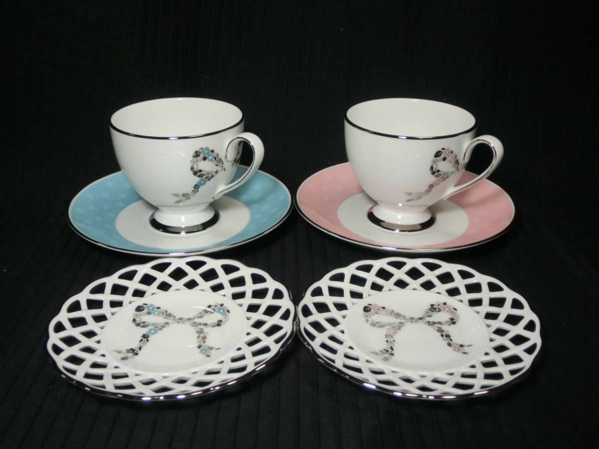 | 商品の特徴 | カップの口径8.3センチ、高さ7.2センチ、ソーサーの直径14.7センチ、レース皿の直径12センチ。ピンクとブルーのリボン柄が可愛い、フェリシータのペア・トリオです。未使用ですが、自宅保管品ですので、見逃した微細なスレ等は、ご容赦下さい。 ヤマト宅急便60サイズで発送致します。(北海道・九州は1150円、北東北・関西は850円、関東・南東北・信越・北陸・中部は750円、中国・950円、四国・1050円、沖縄1600円)割れ物なので、定型外発送は対応致しません。他にもカップやプレート、アクセサリー等出品しています。 ※陶器類は同梱発送出来ます。
