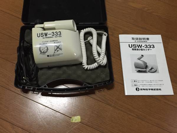| 商品の特徴 | 商品説明 本多電子株式会社製超音波カッターUSW-333ジャンク 商品は画像のもので全てです。 ハンドピースが欠品のため本体のみジャンク扱いになります。 当方個人で使用しておりましたがハンドピースが熱によって変形してしまい使用しなくなりましたので出品しました。 溶ける以前は問題なく使用できていました。 ご希望なら溶けたハンドピースもお付けします。 ハンドピースさえご用意いただければ問題なく使用できると思います。 送料は落札者様負担ではこBOONを予定しております。 ジャンク扱いのためノークレーム、ノーリターン、ノーキャンセルでお願い致します。 (2015年 4月 1日 21時 39分 追加) 画像三枚目ハンドピースの画像を追加しました。