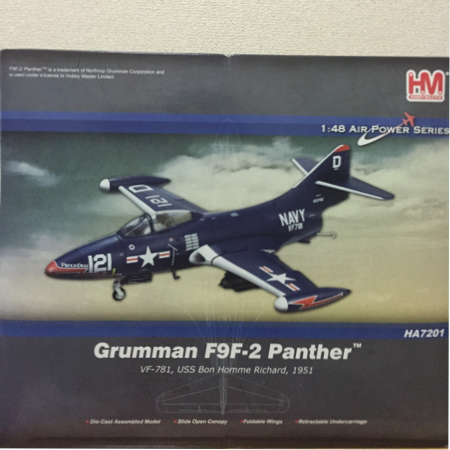 | 商品の特徴 | : HM ホビーマスター F9F-2 パンサー VF-781 Grumman F9Fホビーマスター 1/48 グラマン F9F-2 パンサー VF-781 HA7201 個人保管品ですが、画像のとおり機体は購入時の状態です。 Hobby Master 1⁄48 F9F-2 Panther US Navy 61st Fighter Squadron箱には、経年劣化による細かいキズなどはご理解のうえ入札をお願いします。 Hobby Master 1:48 HA7208 Grumman F9F-5 Panther VF-153 Blue Tail Fly 1953●全長:175mm ●全幅:225mm Grumman F9F-2 Panther 1⁄48 Diecast●重さ:341g ●主翼の折畳可能 ●各種兵装付属 Grumman F9F-2 Panther US Navy VC-61, \"Look\" Korean War, Hobby Master, 1:48 Diecast Model HA7202●飛行時/着陸時用の選択可能 ●キャノピー開閉可能 ●マーキング:USS ボノム・リシャール VF-761 1951年