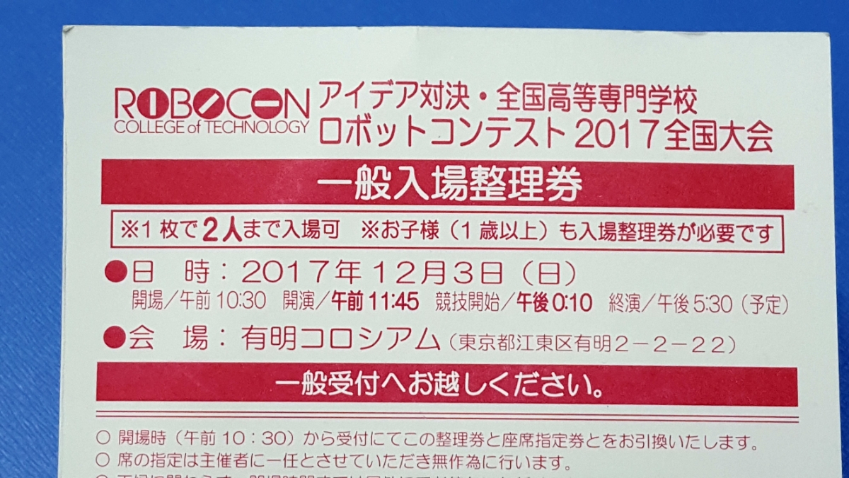 - ホーム > チケット、金券、宿泊予約 > 興行チケット > イベント > その他 >★ 全国高等専門学校 ロボットコンテスト 2017全国大会 12/3 (日) 入場整理券 【2名】 NHK 高専 ロボコン アイデア対決 有明コロシアム