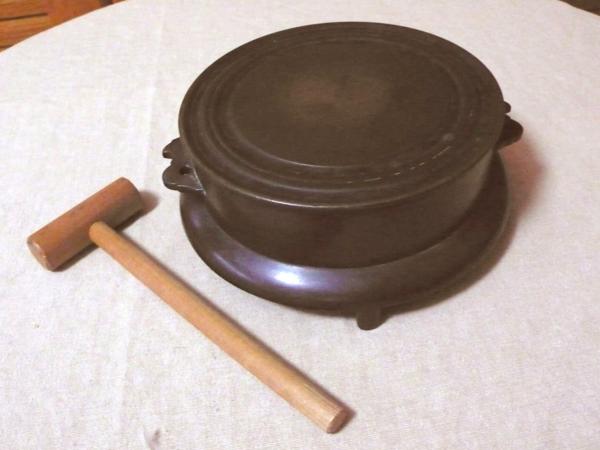 | 商品の特徴 | 【EMA商店】へようこそ! ★目に止めていただきまして、どうもありがとうございます。(^-^)★ 江戸~明治ごろの珍しく大きな鉦鐘です。 昔、寺院の仏具として、 または「火災信号」として消防隊や消防団出動の合図や 召集連絡に、こういった鐘(半鐘)が使われていました。 「カンカンカン,カンカンカン」と3回鳴らし, 少し間隔を開けてまた3回…を繰り返すのが「出場信号」といって、 消防隊や消防団の出動の合図でした。 今では電子音でお馴染みですね! 現在でも仏具としてや、茶席の客人を招く合図 祭囃子(まつりばやし おはやし)での利用もされています。 銅の質も良く重量もあり、 しっかりとした造りで価値ある逸品です。 吊るして叩くとカ~ン♪カ~ン♪と良くなります。 只今動画も公開中!←クリックしてください。 脚が付いていて、 置いて鳴らす事も出来ます。 (その時は音のサスティーンは短くなります。) 木製の槌(撞木【しゅもく】)も付属します。 状態はとても味わい深く良い思いますが、 古いものですので画像もご確認の上ご検討ください サイズ(約寸) 上部直径15.5cm、下部直径17.5cm 厚み5.5cm(脚含め約7cm) 重量1.8kgほど 付属品 木製の槌(撞木【しゅもく】) お部屋などに飾ってインテリアとしてもお楽しみください。 茶道具や花台飾り台としても◎ 古民具と共に充実した生活を★ ※厳重に梱包の上発送いたします。 (消費税はかかりません【税込】)
