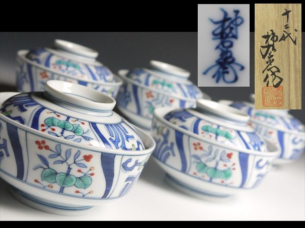 - ホーム > アンティーク、コレクション > 工芸品 > 陶芸 > 日本の陶磁 > 伊万里、有田 >Y974 十二代 酒井田柿右衛門 染錦 捻花鳥画 蓋物 五客 共箱