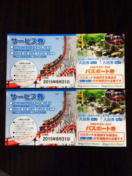| 商品の特徴 | ★商品説明★ ナガシマスパーランド 1dayパスポート券×2枚の出品です。 ナガシマスパーランドペアチケット、乗り物乗り放題券 ナガシマスパー・遊園地乗り放題(1名分) 2025年 ナガシマスパーランドパスポート券or入浴券のセット2枚・湯あみの島(2名分) ・里の湯(2名分) ナガシマスパーランド パスポート券2枚上記3つのうち、いずれかひとつに利用可能です。プールでは利用できません。 ナガシマスパーランドペアチケット、乗り物乗り放題券 ナガシマスパー有効期限は2015年8月31日ですのでご注意ください。 ☆ナガシマスパーランド☆パスポート券 2名様分 長島温泉 湯あみの島の落札後は早急に対応します。 券面に『本券ご利用の際は、必ずメンバーズカードをご持参ください。』と記入があります。過去に使用した時は提示を求められませんでしたが、気になる方は入札をご遠慮ください。 ★支払方法★ ・ヤフーかんたん決済 ・ジャパンネット銀行 ・ゆうちょ銀行 ★発送方法★ ・普通郵便(無料) ・速達(280円追加) ・近くまで来られる方は手渡しもOK ★コメント★ 有効期限が間近です。 ご理解いただける方の入札お待ちしております。 ノークレームノーリターンでお願いします。