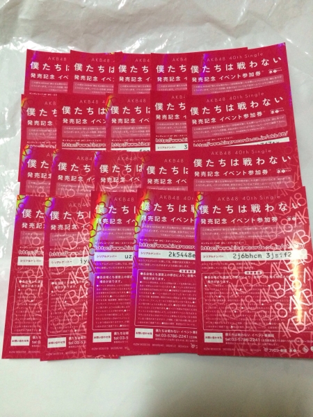 | 商品の特徴 | AKB48 AKB48 僕たちは戦わない 全国握手会 イベント参加券 10枚セットAKB48 40thシングル 僕たちは戦わない 発売記念イベント参加券20枚セットです。イベントの日程等は公式サイトにてご確認ください。スマートレターにて発送。送料180円の負担を併せてお願い致します。その他の発送をご希望の方はご相談ください。