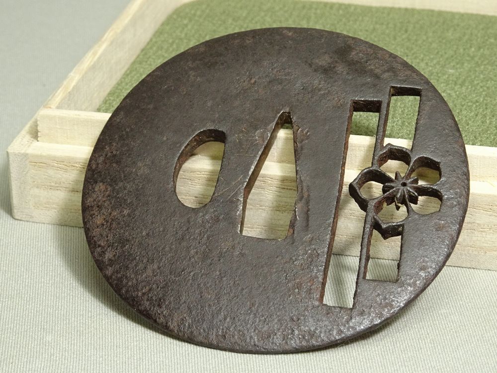 - ホーム > アンティーク、コレクション > 武具 > 鍔、刀装具 >【518】名鐔 在銘 重次 格子桜透かし図 阿弥陀鑢 鉄地 小透 堅丸形 片櫃穴 桐箱付