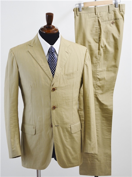 | 商品の特徴 | 【商品説明】 ・春夏対応。3つボタンシングル。背抜き。サイドベンツ。フラップポケット。ネーム刺繍なし。 ノータック。裾シングル。 ・カラー:ベージュ無地 ※PC環境によって色味に誤差が生じる場合がございますのでご了承下さい。 ・素材:画像参照 ・表記サイズ:ジャケット「44」:スラックス「76」 ・参考日本サイズ:「M」「Y5体」程度 (実寸サイズを参考にスタッフがスーツサイズを割り出したため、表記サイズと異なっている場合がございます。1つの理由としては前所有者様が寸法直しなどをされた事等が考えられます。あくまでスタッフの主観となりますので必ず実寸をご確認下さい。) ・実寸:[ジャケット] 着丈72 袖丈60.5 肩幅45.5 身幅50 [スラックス] ウエスト77 股上25 股下83 モモ幅28.5 裾幅20.5 [単位cm] 「ウエストは最大4cmひろげることができます。裾(股下)はシングルで最高7cm出せます。」 ※スラックスの補整等は当店では承っておりません。 ■状態評価は 「表地(全体的)」 と、 「裏地」 の2種類の状態を分けて表記させて頂いております。 表地(全体的)状態: B(全体に着用感がございますが、特に目立つ汚れや破れなどが見受けられず、今後も十分ご愛用頂けるお品です。) 裏地状態: A+B+C(薄い汚れあり) お取引の流れ